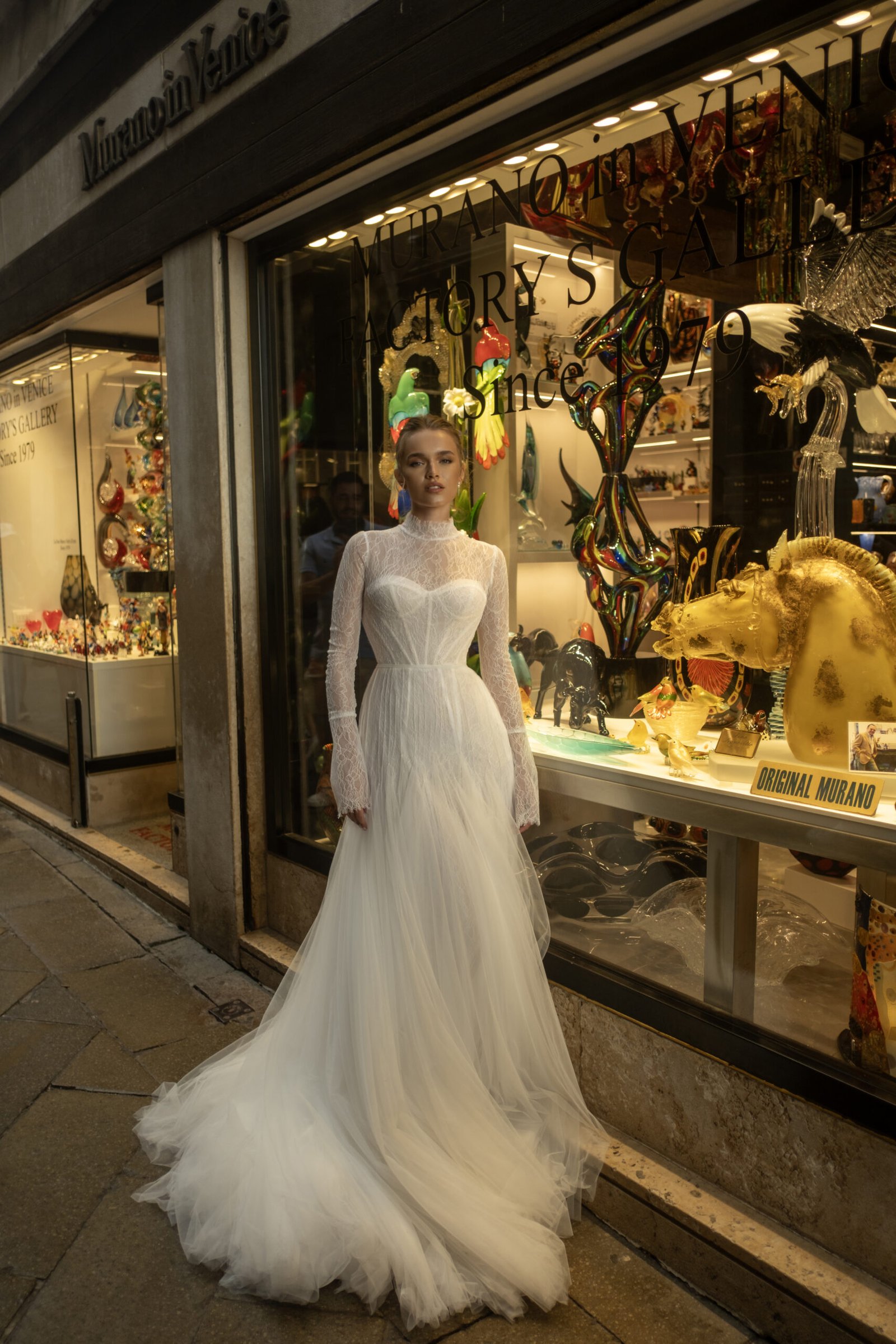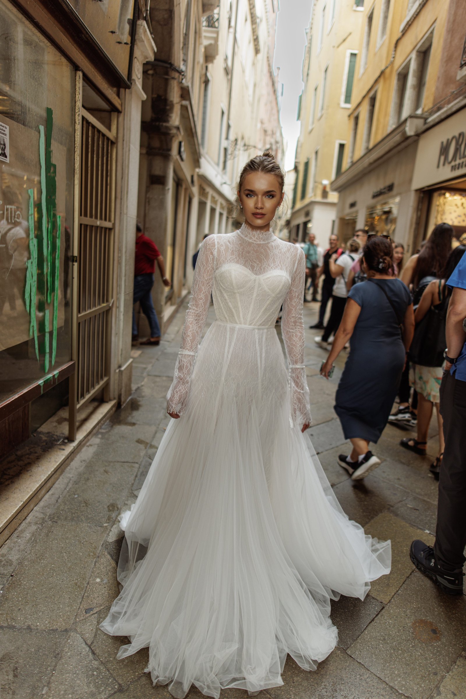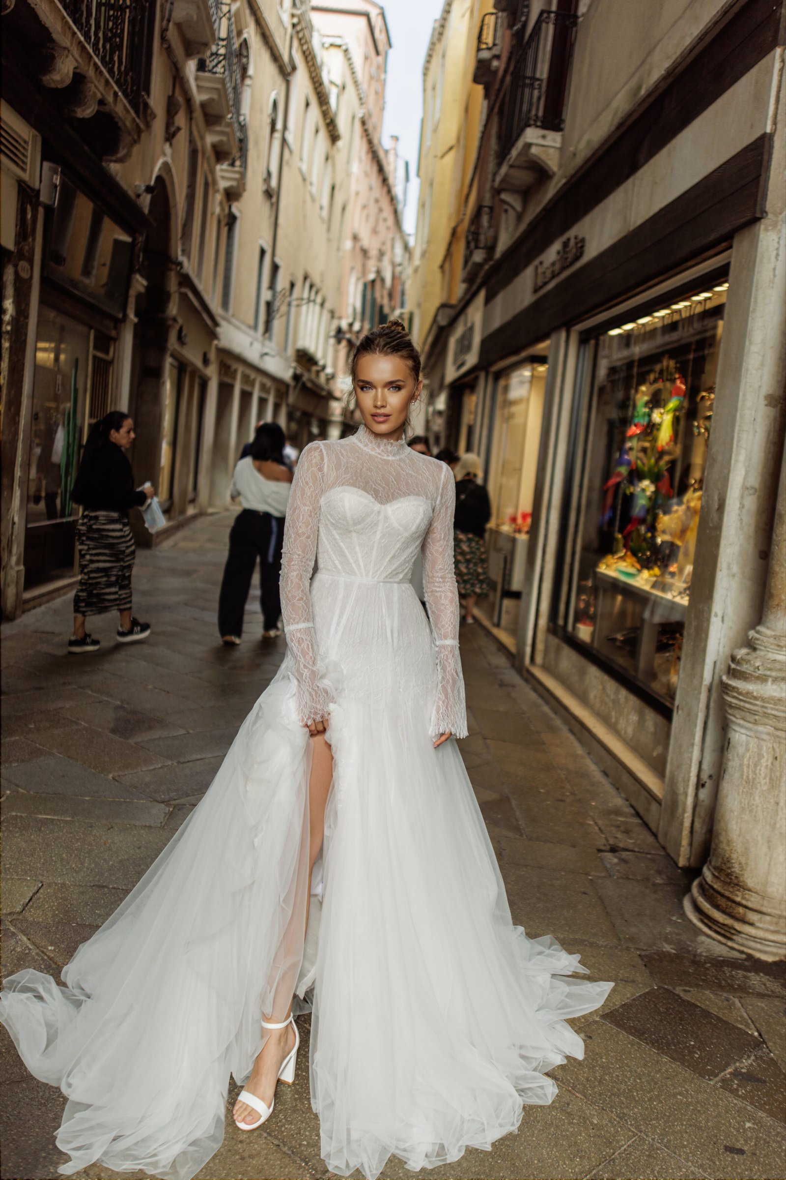 A captivating creation that exudes modern elegance and timeless allure. This design features a beautifully structured silhouette, enhanced by exquisite detailing and luxurious textures. Every element — from the delicate neckline to the intricate embellishments — is thoughtfully crafted to highlight femininity and sophistication, making it a perfect choice for the bride who seeks both grace and glamour.