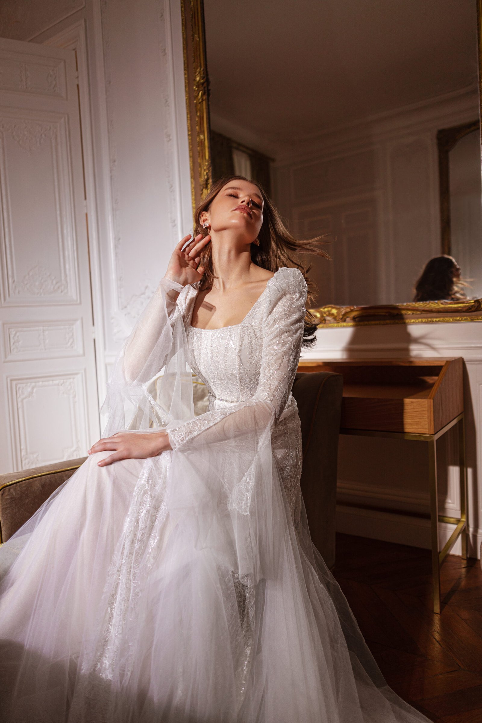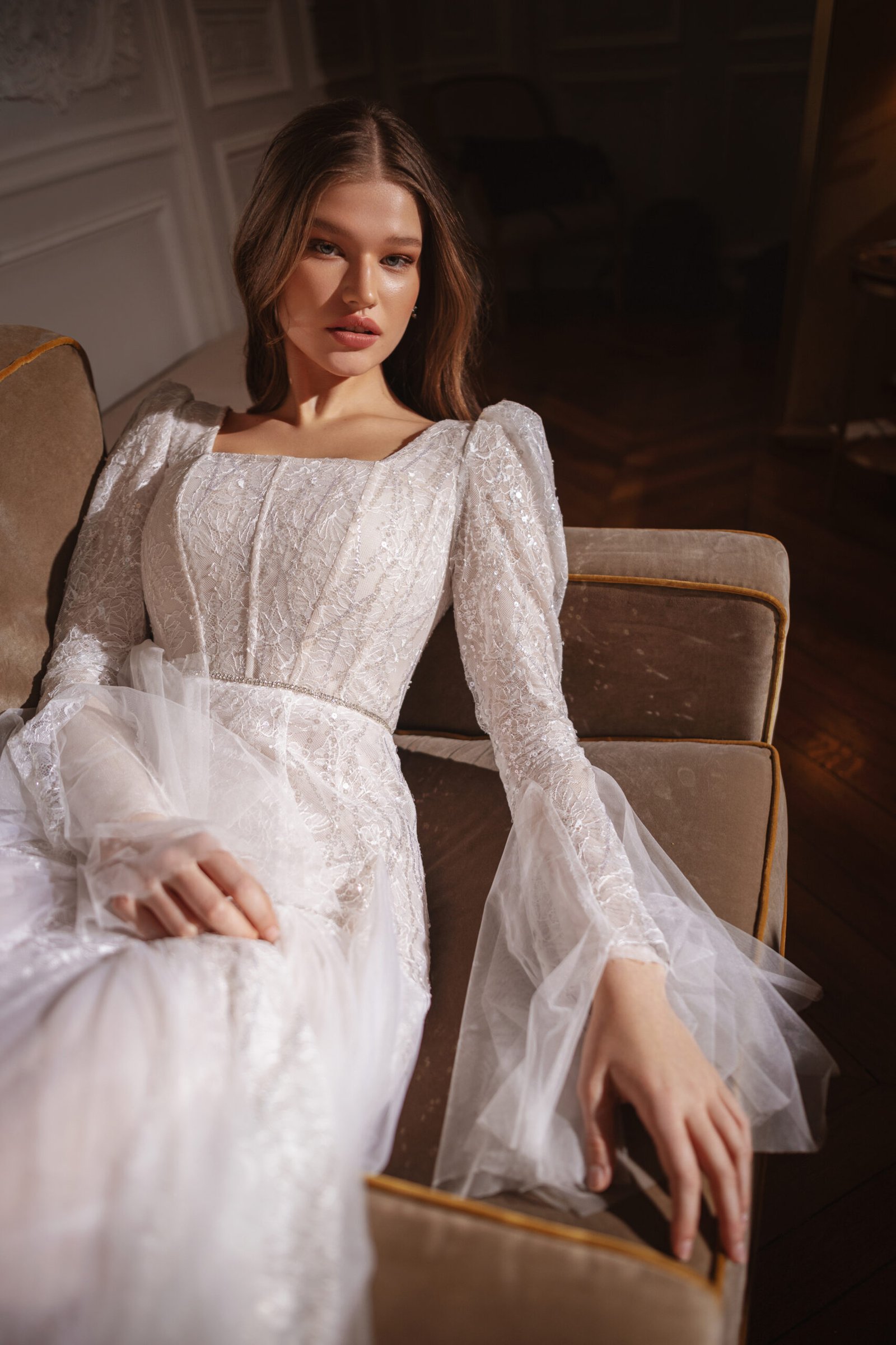 A captivating creation that exudes modern elegance and timeless allure. This design features a beautifully structured silhouette, enhanced by exquisite detailing and luxurious textures. Every element — from the delicate neckline to the intricate embellishments — is thoughtfully crafted to highlight femininity and sophistication, making it a perfect choice for the bride who seeks both grace and glamour.