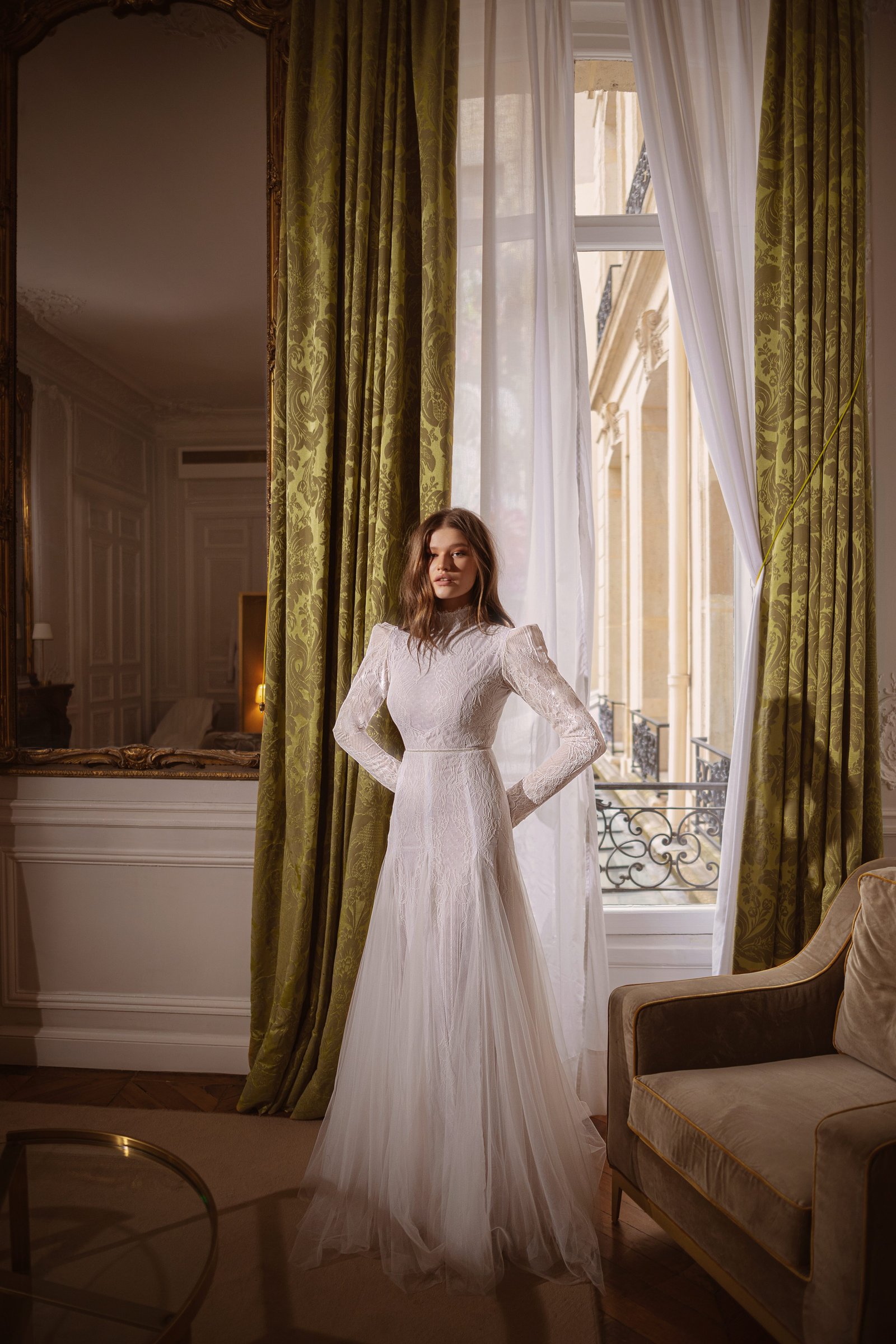 A captivating creation that exudes modern elegance and timeless allure. This design features a beautifully structured silhouette, enhanced by exquisite detailing and luxurious textures. Every element — from the delicate neckline to the intricate embellishments — is thoughtfully crafted to highlight femininity and sophistication, making it a perfect choice for the bride who seeks both grace and glamour.
