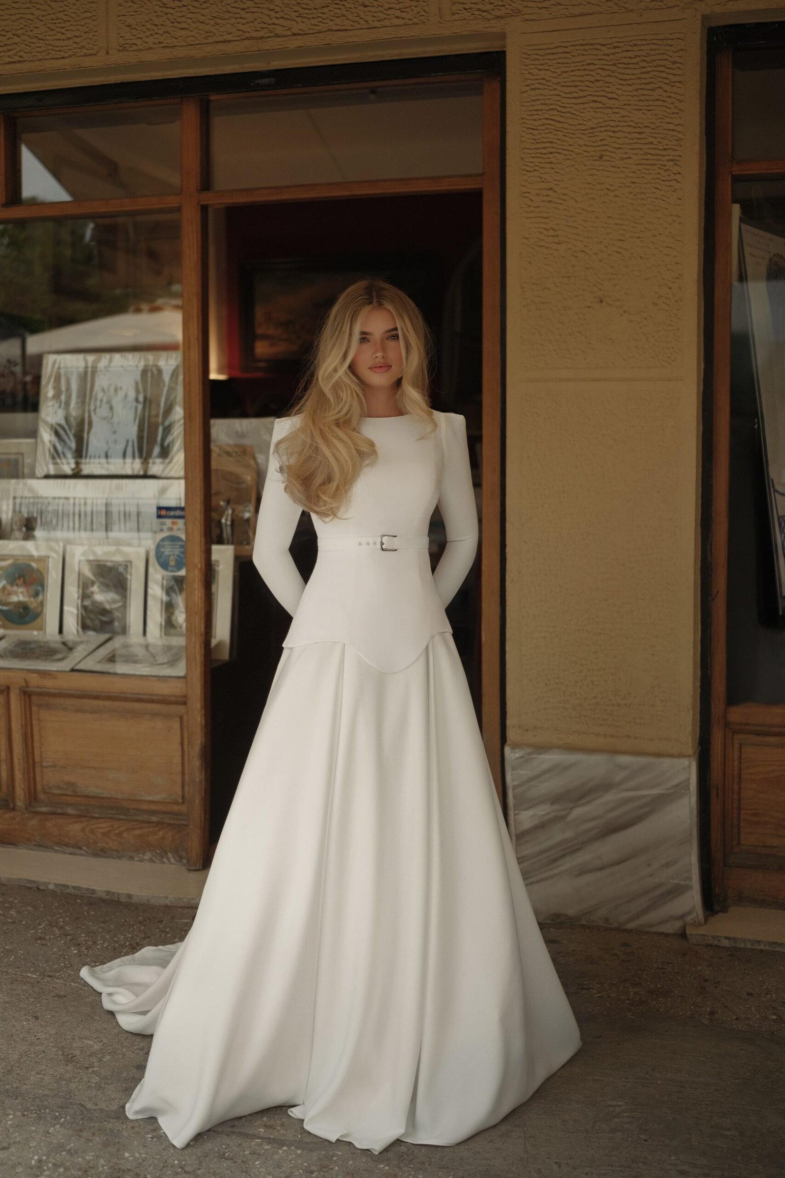 A captivating creation that exudes modern elegance and timeless allure. This design features a beautifully structured silhouette, enhanced by exquisite detailing and luxurious textures. Every element — from the delicate neckline to the intricate embellishments — is thoughtfully crafted to highlight femininity and sophistication, making it a perfect choice for the bride who seeks both grace and glamour.