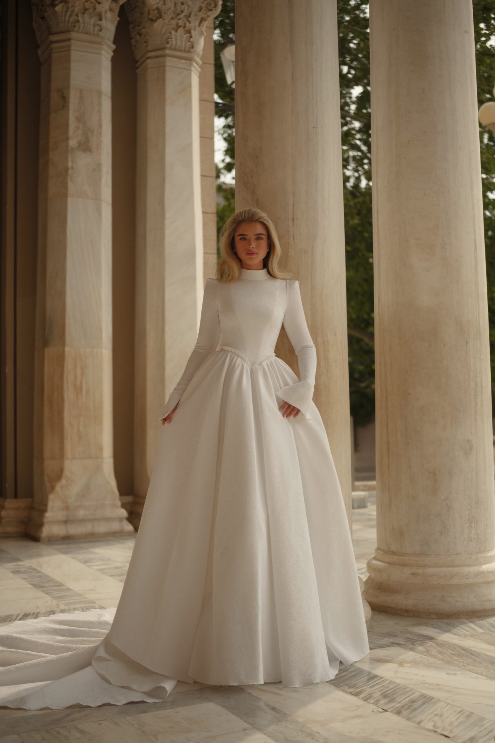 A captivating creation that exudes modern elegance and timeless allure. This design features a beautifully structured silhouette, enhanced by exquisite detailing and luxurious textures. Every element — from the delicate neckline to the intricate embellishments — is thoughtfully crafted to highlight femininity and sophistication, making it a perfect choice for the bride who seeks both grace and glamour.