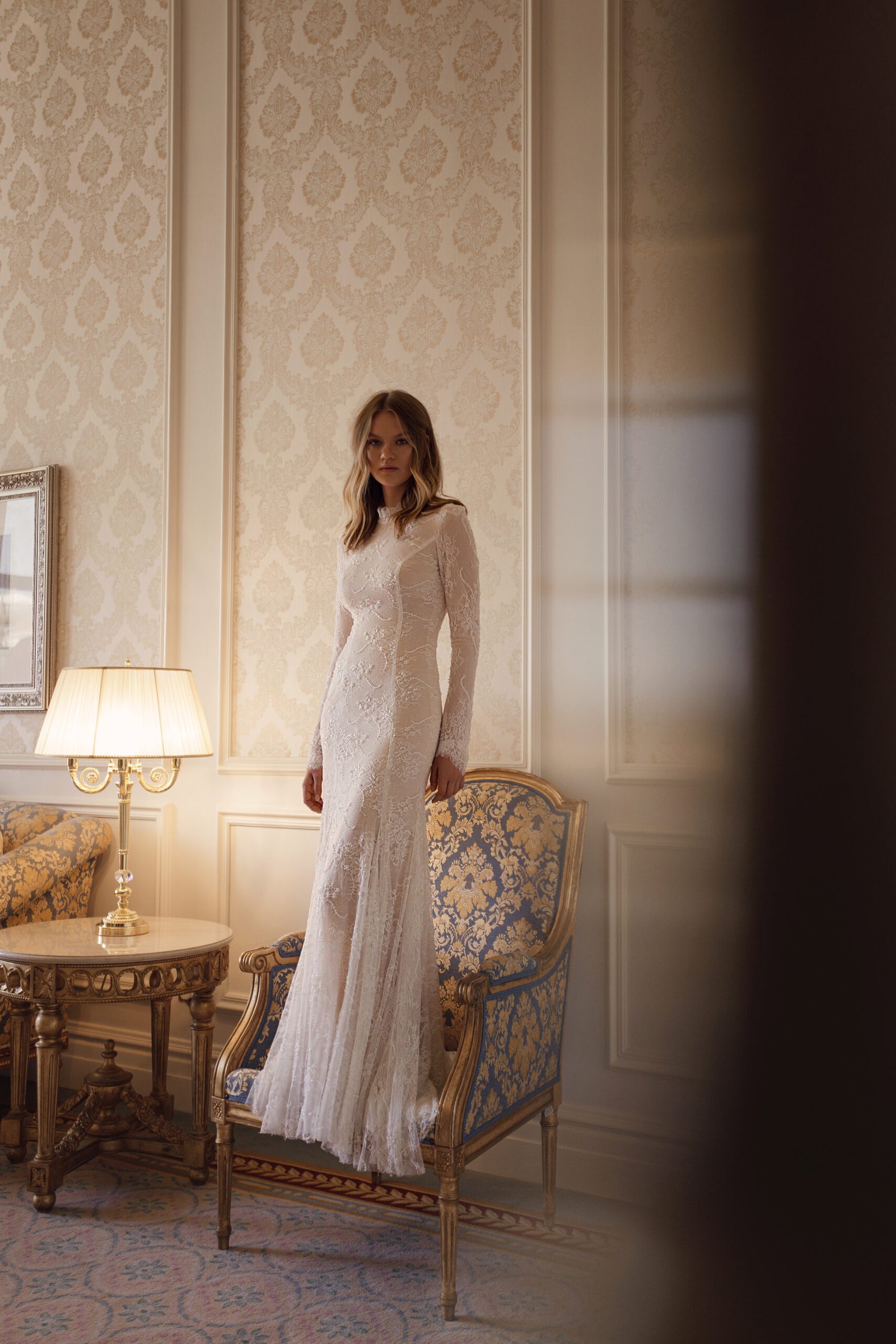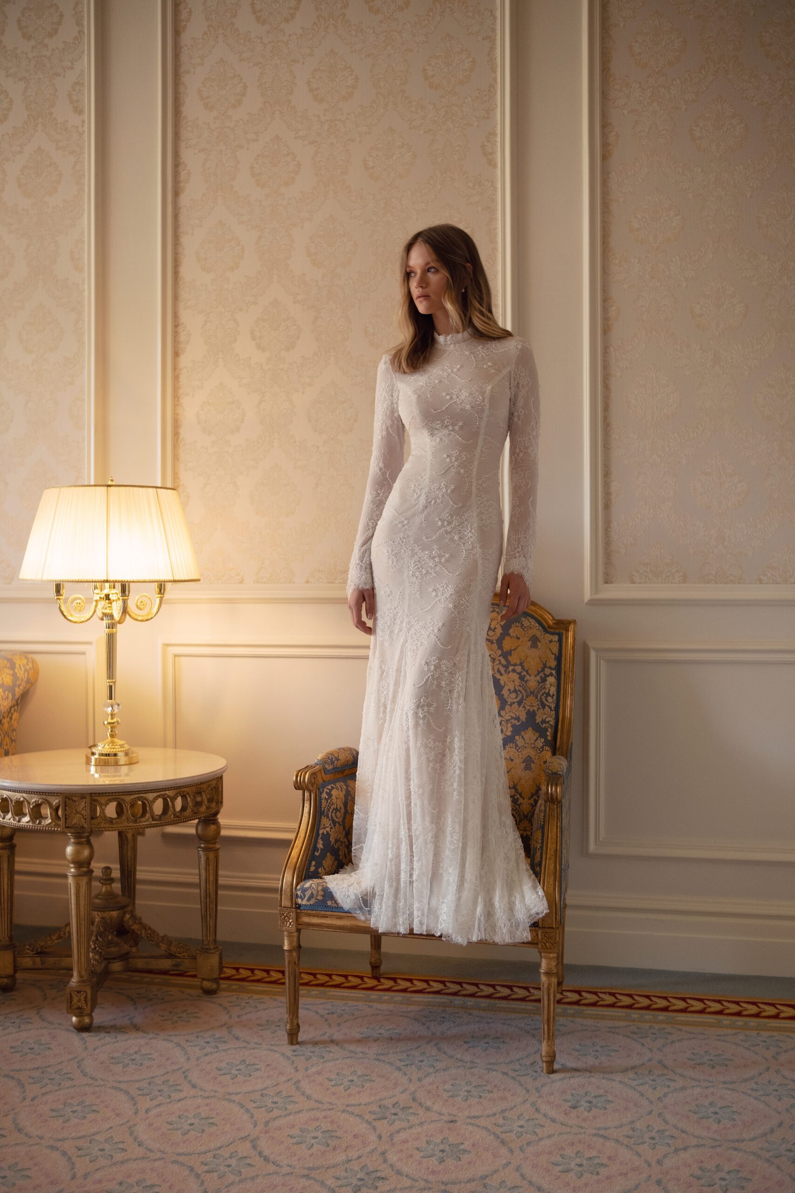 A captivating creation that exudes modern elegance and timeless allure. This design features a beautifully structured silhouette, enhanced by exquisite detailing and luxurious textures. Every element — from the delicate neckline to the intricate embellishments — is thoughtfully crafted to highlight femininity and sophistication, making it a perfect choice for the bride who seeks both grace and glamour.