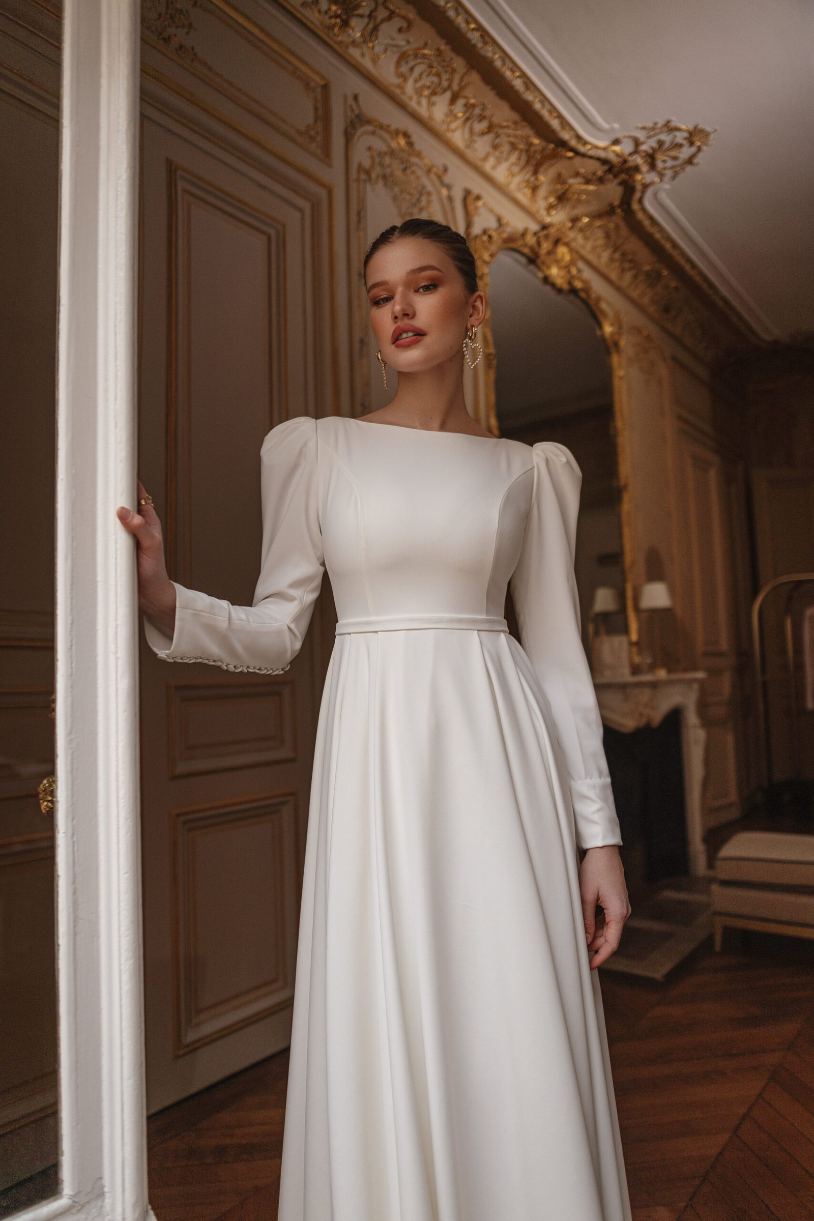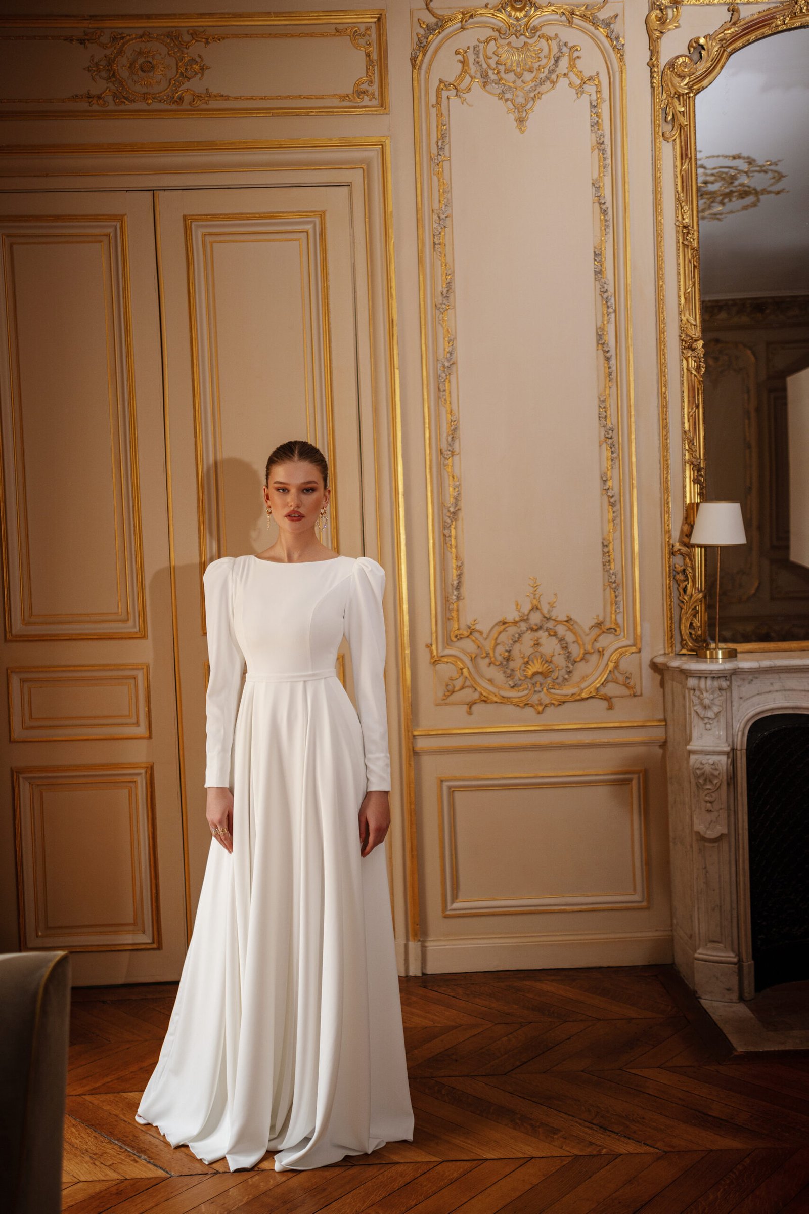 A captivating creation that exudes modern elegance and timeless allure. This design features a beautifully structured silhouette, enhanced by exquisite detailing and luxurious textures. Every element — from the delicate neckline to the intricate embellishments — is thoughtfully crafted to highlight femininity and sophistication, making it a perfect choice for the bride who seeks both grace and glamour.