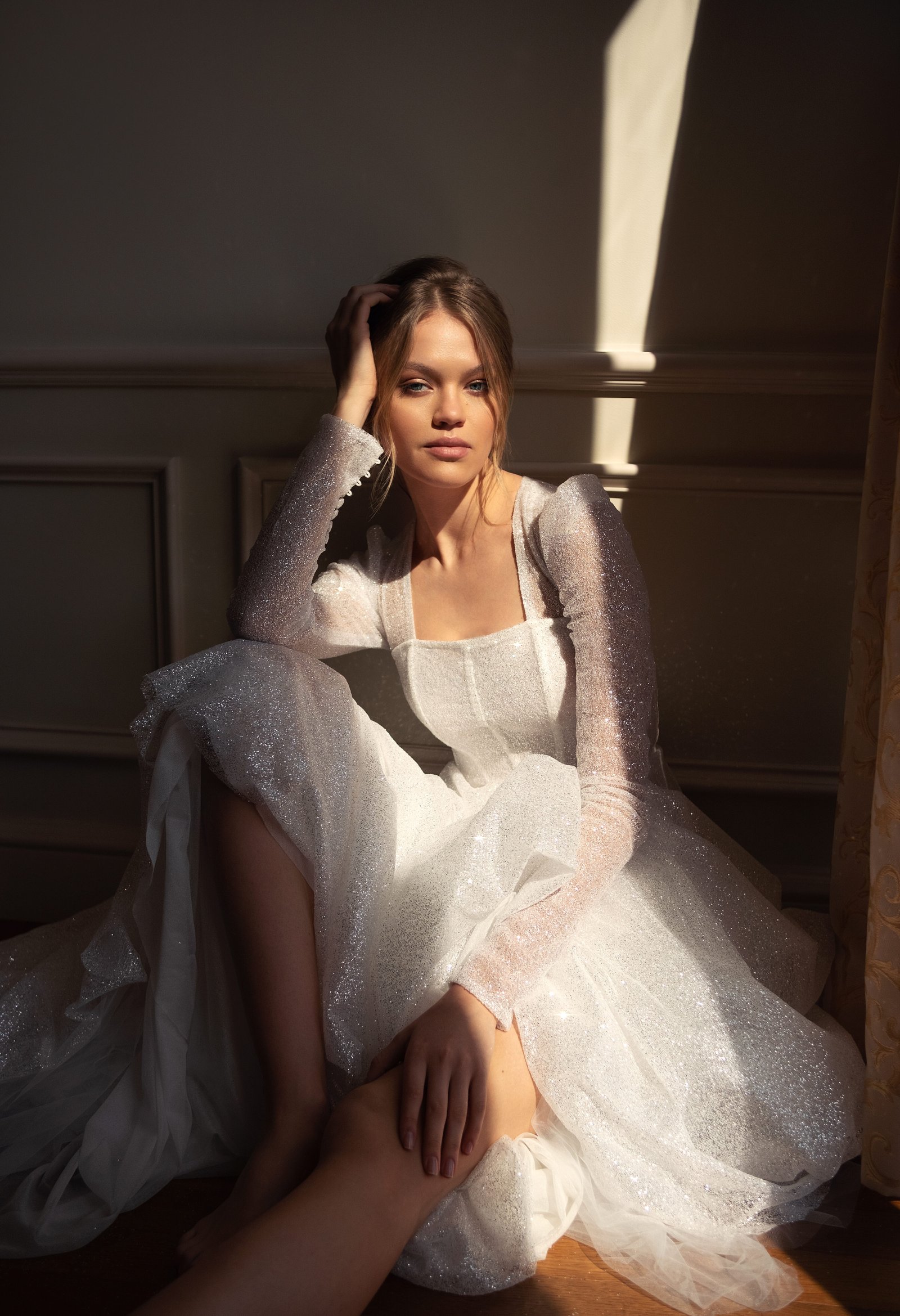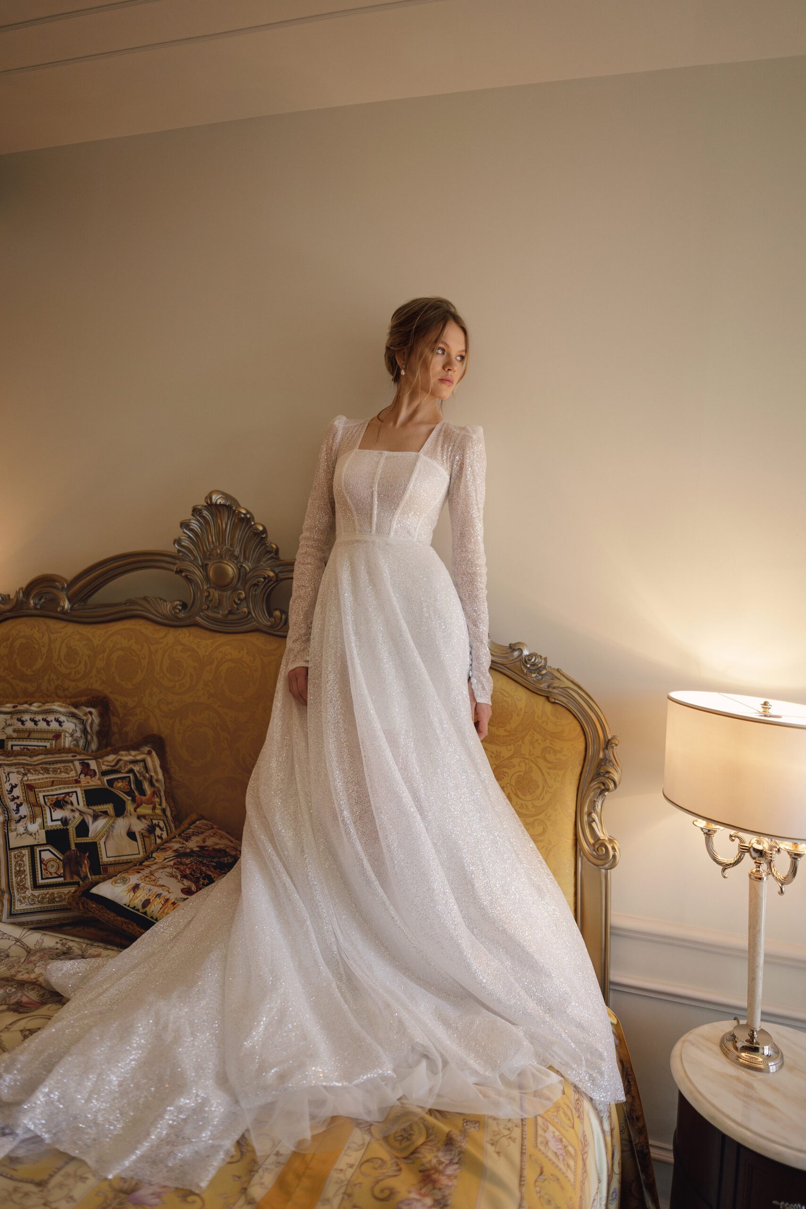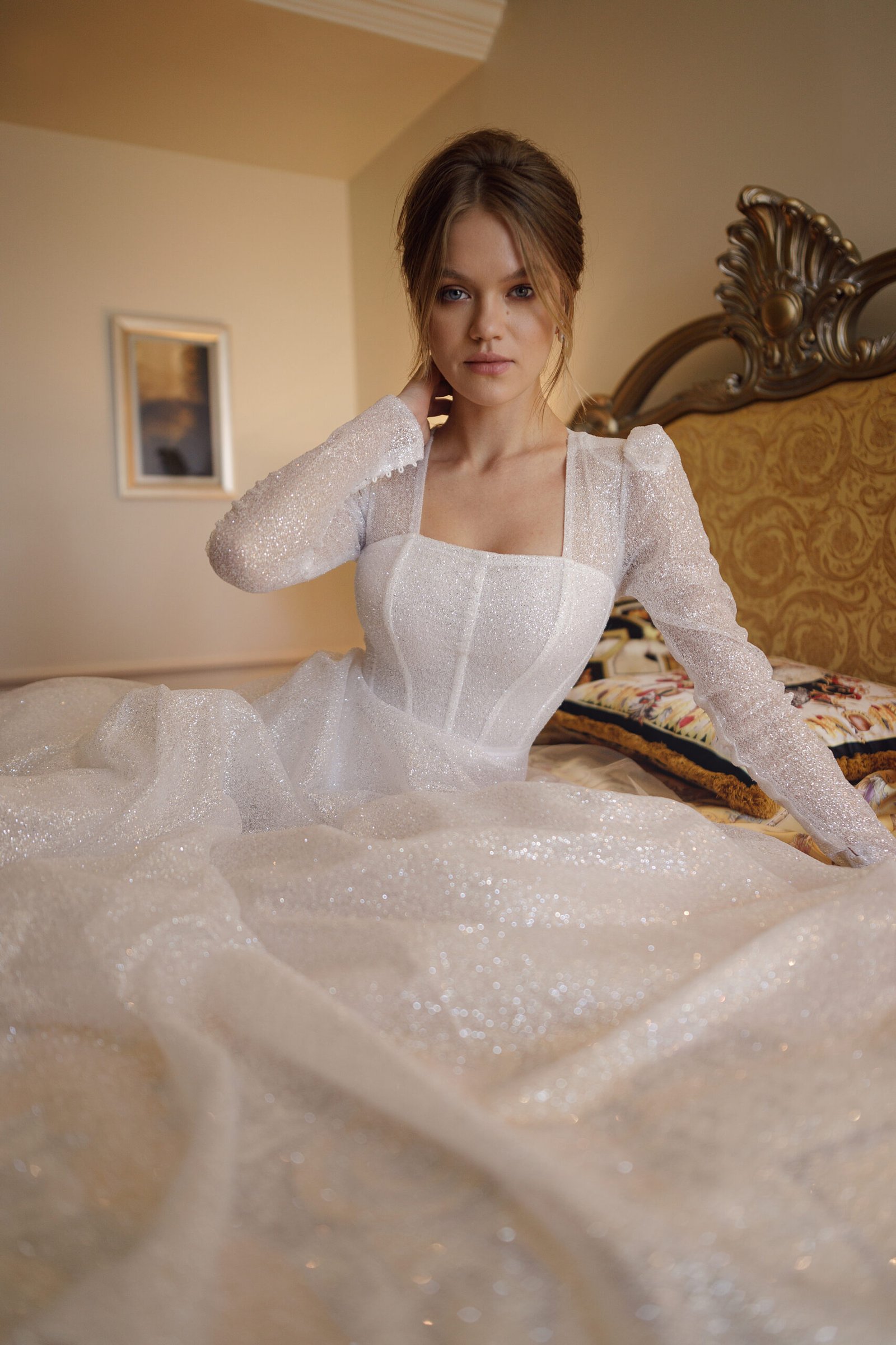 A captivating creation that exudes modern elegance and timeless allure. This design features a beautifully structured silhouette, enhanced by exquisite detailing and luxurious textures. Every element — from the delicate neckline to the intricate embellishments — is thoughtfully crafted to highlight femininity and sophistication, making it a perfect choice for the bride who seeks both grace and glamour.