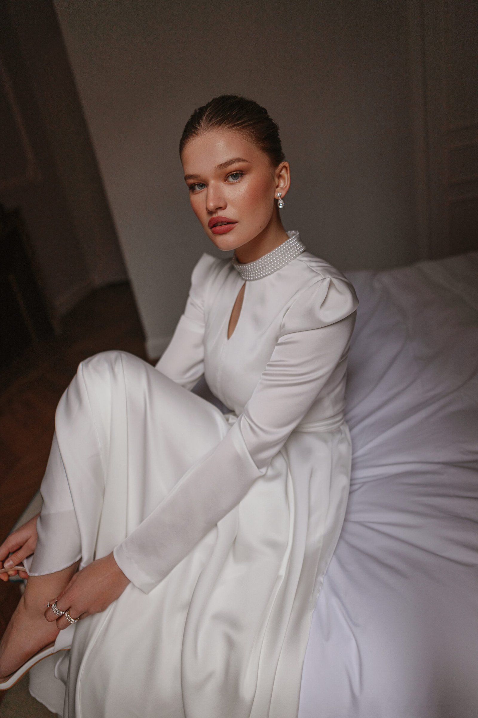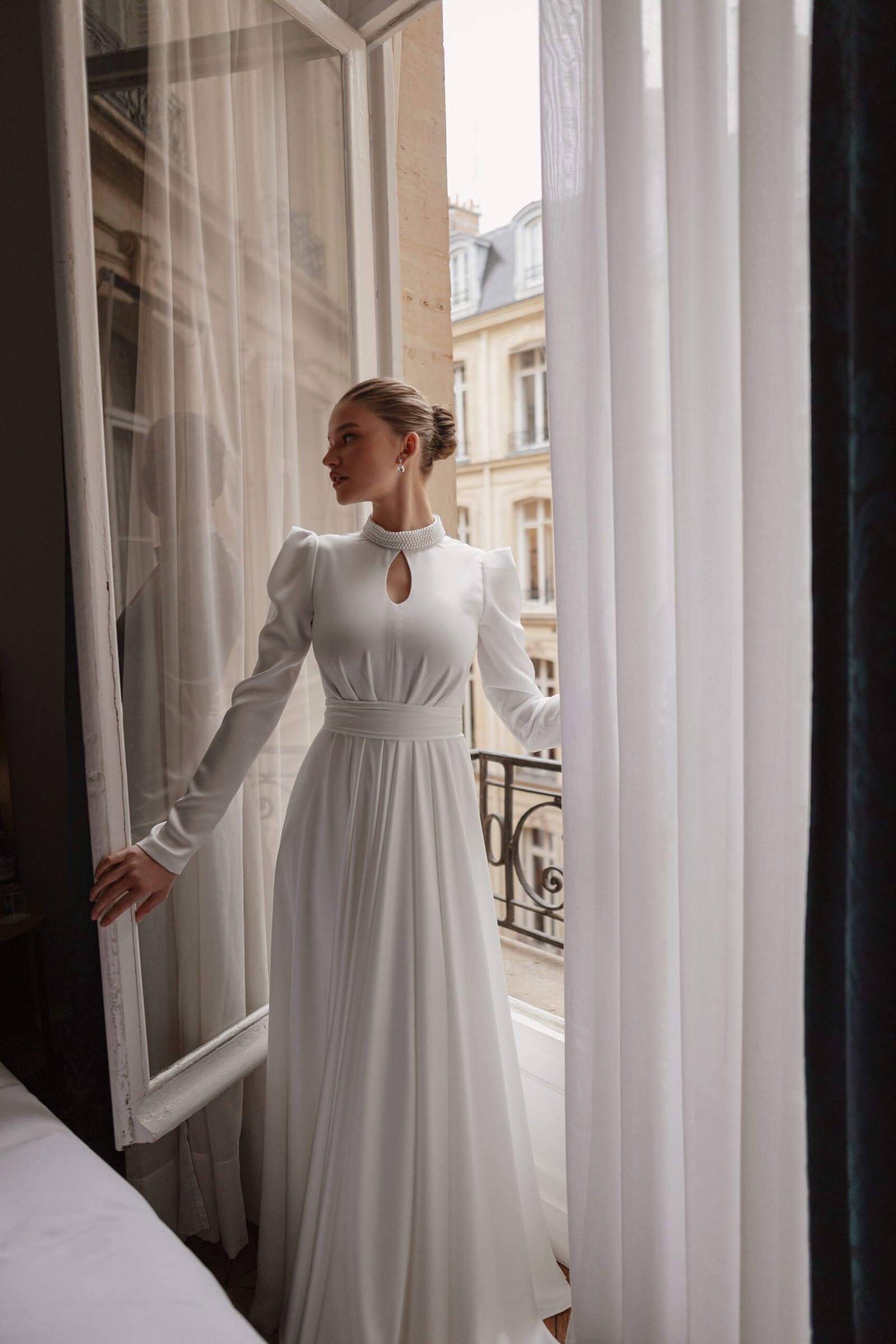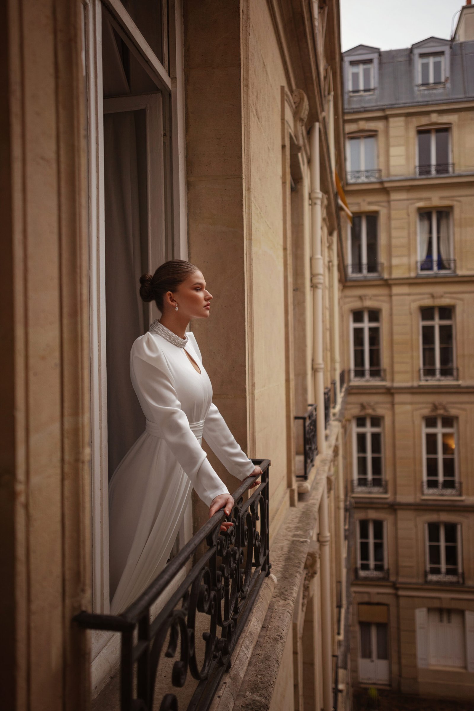 A captivating creation that exudes modern elegance and timeless allure. This design features a beautifully structured silhouette, enhanced by exquisite detailing and luxurious textures. Every element — from the delicate neckline to the intricate embellishments — is thoughtfully crafted to highlight femininity and sophistication, making it a perfect choice for the bride who seeks both grace and glamour.
